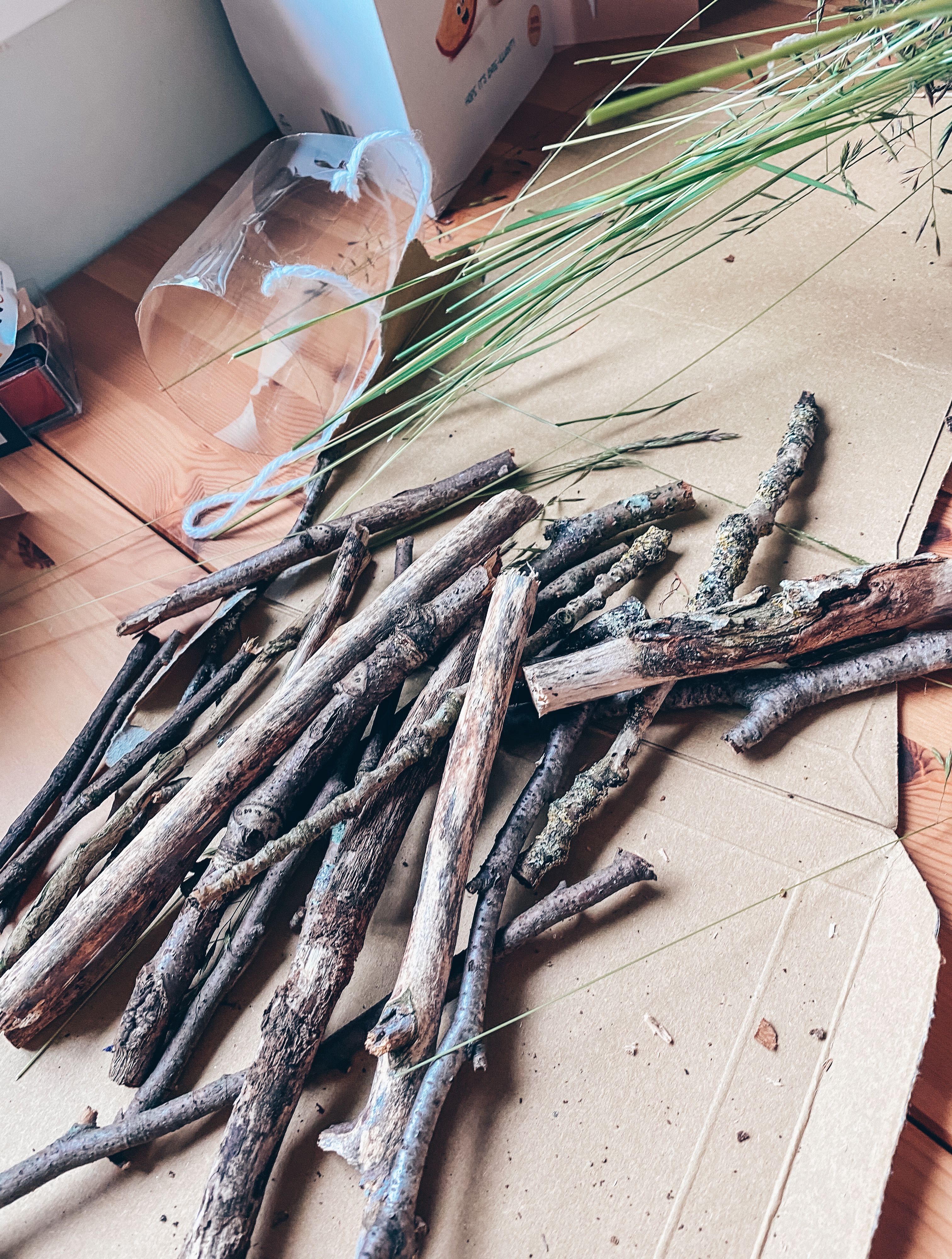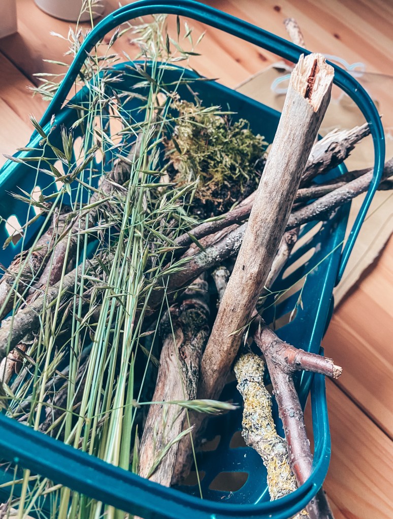 3. Then it is time to start filling it up! Put sticks in first to bulk it out and then start adding the long grass and moss. We cut down some of the meadow grass growing in our garden and foraged the moss from some of our flowers pots.